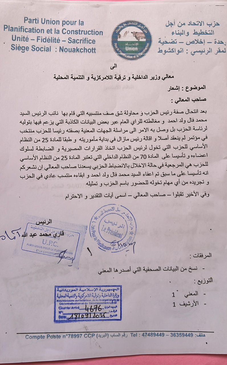 فخامة رئيس الجمهورية، السيد محمد ولد الشيخ الغزواني، يتسلم اليوم من السيد موسى فال، منسق الحوار الوطني، التقرير الذي يضم رؤى ومواقف الأحزاب السياسية والقوى الوطنية بشأن الحوار الوطني المرتقب.