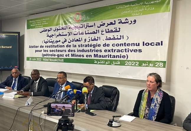 نظمت وزارة البترول والمعادن والطاقة اليوم الثلثاء في نواكشوط، ورشة عمل لعرض دراسة استراتيجية المحتوى المحلي للقطاع الاستخراجي (النفط والغاز والمعادن) في موريتانيا. وهي الدراسة التي إطلاقها في منتصف أبريل 2021.