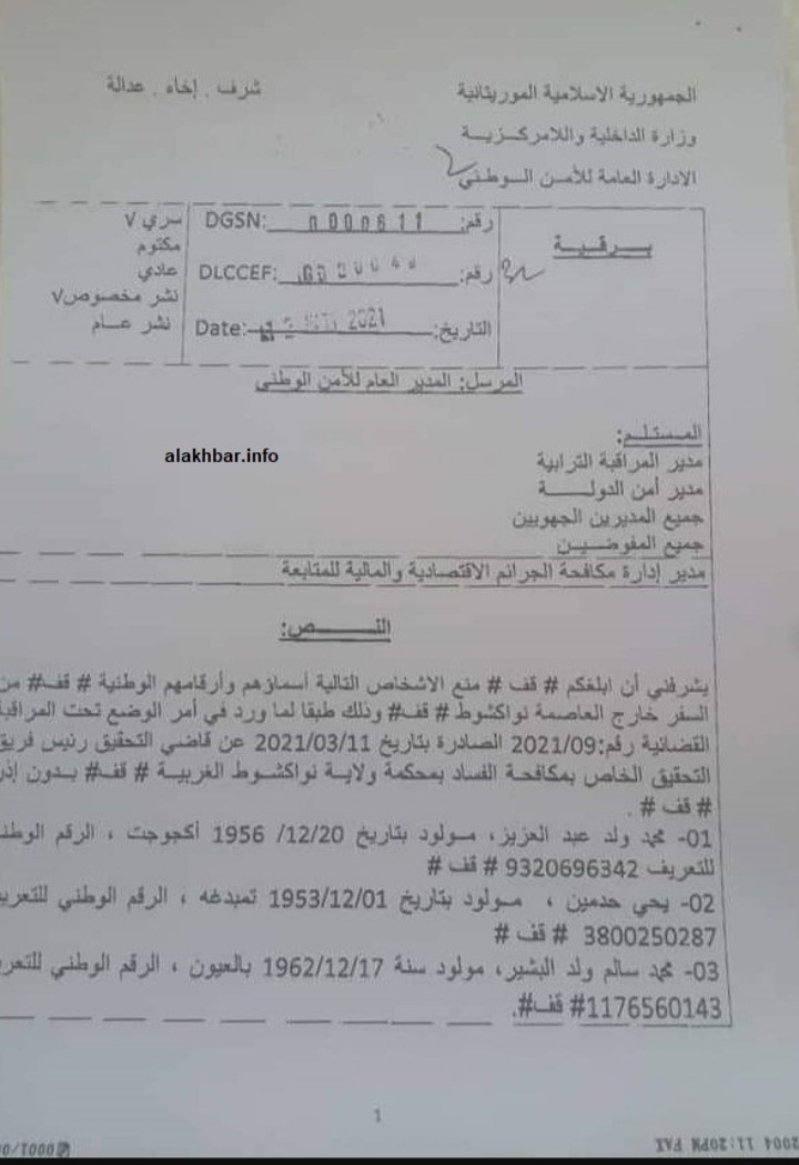 وجه المدير العام للأمن الوطني الفريق مسقارو ولد اغويزي برقية إلى المديرين التابعين لإدارته بمنع من وضعهم قطب التحقيق في الجرائم الاقتصادية تحت المراقبة القضائية من مغادرة العاصمة نواكشوط.