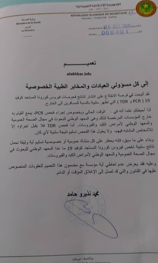 أصدر وزير الصحة محمد نذير ولد حامد قرارا منع بموجبه العيادات والمخابر الخاصة من إجراء فحوصات الكشف عن فيروس كورونا المستجد تحت طائلة العقوبة، التي قد تصل الإغلاق المؤقت أو الدائم.