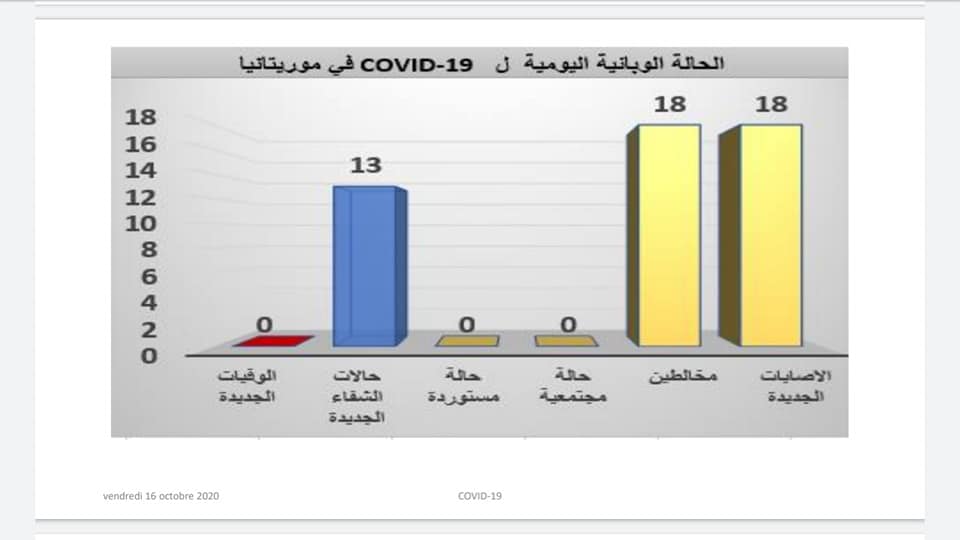 أعلنت وزارة الصحة الموريتانية مساء اليوم الجمعة تسجيل 18 إصابة جديدة بفيروس كورونا المستجد في البلاد، و13 خلال 24 ساعة الأخيرة.